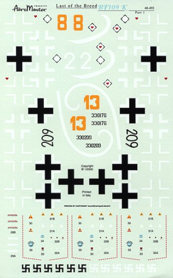 Aeromaster has produced a number of 109 sheets in the last few years and this is one of them. This particular sheet is copyright 2000, which makes it pretty new. Since then, however, there has been a very good and well-researched book on Bf-109K camouflage and it will be interesting to compare this sheet with the book to see if recent findings have made any of the color info supplied here obsolete!