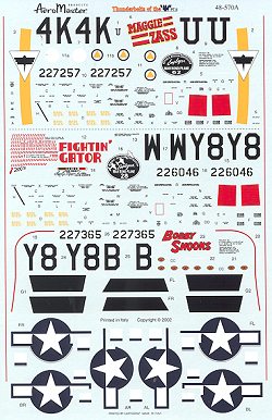 Finally, another Hamilton Standard bird, this -27 is without the fin fillet but does have full lower D-day stripes and the black tail ID bands. This aircraft has the later spoked wheels so you may be doing some hunting in that regard as well. 'Bobby Snooks' has a black nose and anti-glare panel trimmed in red. The wing pylons appear to be painted white; probably part of the D-day stripe scheme.