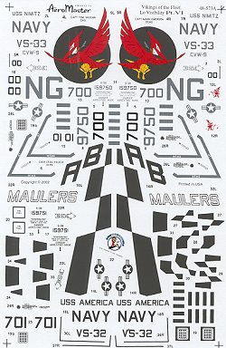 Moving on to the decal sheet, the first one is the CAG bird from VS-33 in 1997. By this time the S-3 was relegated to sea search. The ASW gear removed or just left in for weights and balances, and the last of the carrier borne enlisted flight crew (the ASW system operator - SENSO), gone from the Navy, his place taken by lead weights (this time to ensure proper ejection seat firing). The plane is now doing little but tanking and accumulating flight hours until they are all gone to the boneyard. There is no replacement for it.