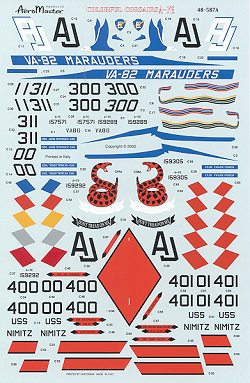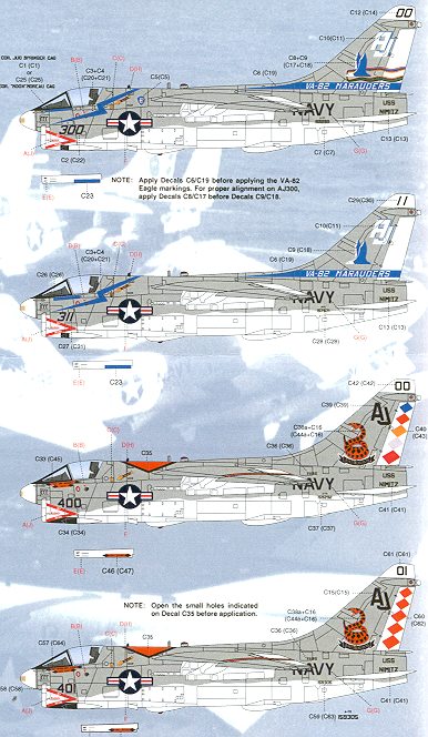 The first thing I thought when I saw this sheet was that I was having a major attack of deja vu. I went to the decal dungeon and pulled out a pre-bankruptcy sheet; SP 48-14 on the USS Nimitz. Folks, this is EXACTLY the same sheet as what was provided in that special. The only difference is the sheet number and the title. In all other respects it is identical. Well, since I haven't reviewed that special, here is what is on it.