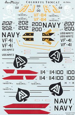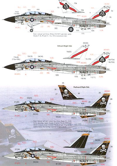 There have been two F-14 squadrons that have had black radomes for its planes. VF-31 and the other subject on this sheet, VF-41. The difference between these two schemes extends past just modex and serials as the CAG code (AJ) on the tailfin is different between the two planes. Otherwise, they are most similar. The 'Aces' have since gone over to the dark side and become VFA-41, flying the F-18F Hornet.
