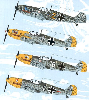 White 10 is from 1./JG 2 and also has a yellow nose and rudder with medium mottling. As with all the planes on this sheet, it is a Bf-109E-4.