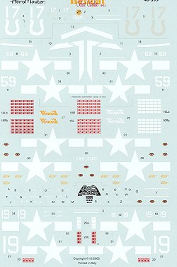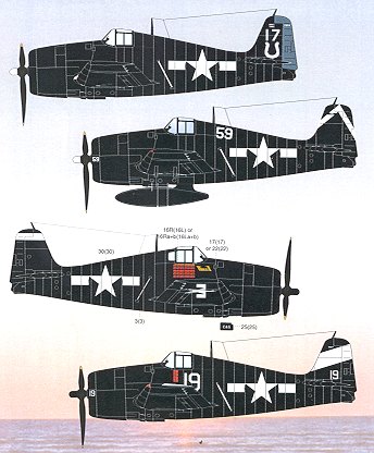 All the hellcats on this sheet are F6F-5s and all are in glossy sea blue. The suggested kits are from Hasegawa and Otaki/Arii, though I'm sure these would fit the old Monogram kit just as well.