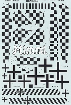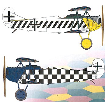 Next is a Jasta 73 plane flown by Wilhelm Hippert. The nose and gear are blue while the fuselage and tailplanes are in black and white checks. There are distinct instructions on how to decal the fuselage on this one to ensure that all is properly aligned.