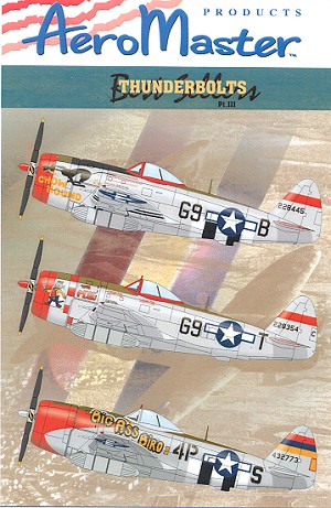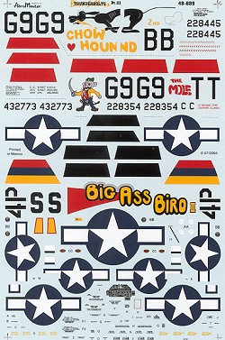 Finally, 'Big Ass Bird' from the 513 FS/406 FG. This P-47D-30 has a nice multicolored fin with yellow trim tab and red nose. The scalloping is provided as a decal (not shown), for painting it would be a challenge. This one has invasion stripes under the fuselage. Aeromaster offers invasion stripes for the P-47 on sheet 48-650/651.