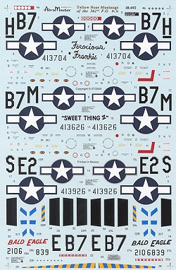 Finally, the lone P-51B, also from the 374 FS. 'Bald Eagle' has the upper wing Invasion stripes over-painted, and has blue/yellow stripes along the lower edge of the nose anti-glare panel, rudder trim tab, and wing tips.