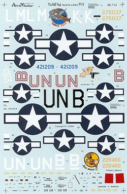 Next is the sheet's lone P-47M, 'Lookin for Trouble' from the 63 FS. This unit painted their Ms in shades of blue on the upper side with bare metal canopy frame, underside and wing leading edges. Much conjecture has gone into what these shades are with many thinking that the unit just mixed insignia blue with white to get the variations in shade. Your choice on this. The rudder and serial are in a light blue while the cowling front is red.
