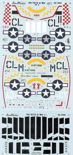 This sheet covers three planes from two of the squadrons of the 55th FG. There are insignia for all and data markings for one with enough ID bands for all the aircraft involved. All the yellow parts on the planes will have to be painted by the modeler prior to applying decals.