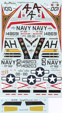 The other option is yet another CAG bird, this time from VF-162 aboard the USS Oriskany in 1967. This F-8E has replacement gun panels in what appears to be yellow zinc chromate primer. These are provided as decals should you not wish to paint it. Note that there is no ECM fairing on the fin and there is a black section painted aft of a cooling exhaust outlet on the right side.