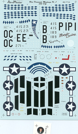 The sheet provides enough common markings for one aircraft. There are also extra blue diamonds in case they are needed. Once again, there is a high quality nose art marking. One simply puts down the white background and then applied the nose art to it.