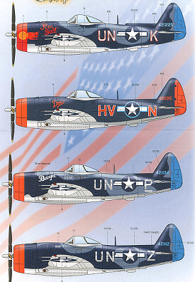 Third is 'Bernyce' fo the 63rd FS. it also has the two blues upper surface. The cowling is red as on all 56 FS Thunderbolts at this time. Blue rudder.
