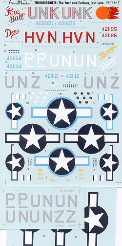 Late Note. One is that P-47Ms generally did not have wing pylons as the removal of them would boost the speed by 20mph so leave them off your model. Secondly, the folks at Aeromaster state that the lighter of the two fuselage blues is probably not Azure Blue, a color not generally found in the UK as it was a desert color and so shipped to the areas where those shades would be used. They surmise that when one has Insignia Blue (as was probably used for the darker shade) and white, it would be easy enough to mix up something and not have to delve into the RAF supply system for a non-Northern Europe camo color. Makes sense to me.
