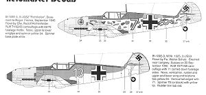 Now for the 109 schemes. The first one is from JG 53. This E-4/B is in RLM 70/71/65, though as the instructions say, it may be in 74/75 uppers (a more likely scheme for an E-4). It has a yellow nose and rudder with a red stripe on the nose. The commander of JG 53's wife was Jewish and so as 'punishment' the Group could not carry the 'Pik As' ace of spades marking normally used by this group. Several pilots in the group protested by over-painting the tail swastika on their planes. When the group changed commanders, the insignia returned. Unfortunately the commander was an excellent leader and his career was basically stalled for the duration of the war.