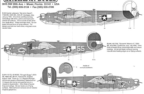 First is 'My Achin' Back' from the 15th AF's 449 BW. The tail in this case is white, yellow and black segments. The sheet provides the yellow and black part; you have to paint the white. There is also a yellow fuselage stripe. All of the de-icer boots were removed so this will be natural metal. There is also a yellow patch on the center section of the horizontal stab that is supplied as a decal.