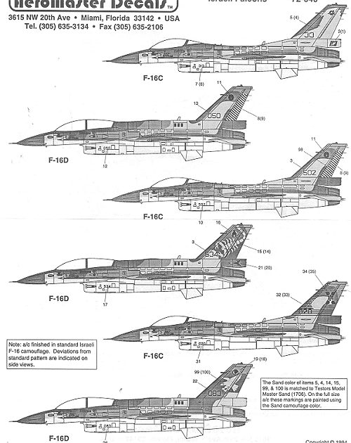 The colors given for these planes is Blue, Sand, Green-grey and Brown. No FS colors are given at all and only the sand is stated to match Testors #1706 so that the fin decals don't look too awful. The only other note is that they are in the 'standard' Israeli F-16 camouflage. Now I'm not too much up on Israeli colors, but I do understand that the 'usual' scheme for the Skyhawk, F-4 and so on is not used on these planes. From an interested reader, here are the colors used: USE ON THE F-16A/B/C/D. TOP SURFACE SAND F.S.33531, BROWN F.S.30219, GREEN F.S.34424 (RAF W.W.II SKY), BOTTOM SURFACE LIGHT GHOST GRAY.
