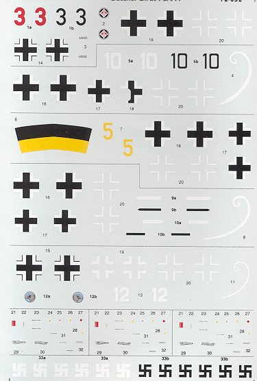 Aeromaster provided several 190 sheets in 1/72 for those who like the Butcher Bird. This particular sheet has five nice schemes on it. There are enough data markings and tail swastikas to do three of the aircraft, though there are national insignia for all five.