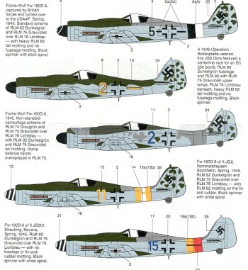 All but Green 2 are in RLM 82/75/76 colors. For those of you not familiar with this coding of colors, Luftwaffe aircraft generally have two upper colors and a lower color. The two upper colors are given first and the lower color last. If you see two or four numbers, the last number is always the underside color.