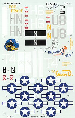This is the second sheet of European based B-24s. All of them are in the easy to paint OD over neutral grey with various colors on the outer fin and engine cowlings. This 1997 sheet suggests the Minicraft series of B-24s and I'd echo that this is probably the best one on the market at this time. However, if your penchant is for older kits with rivets, then I'm sure that the Airfix kit would work just as well.