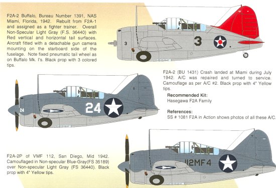 Finally, A VMF-112 F2A-2P photo bird from NAS San Diego (now Miramar), also in mid 1942 after the removal of the red and white tail stripes and the red dot from the insignia.