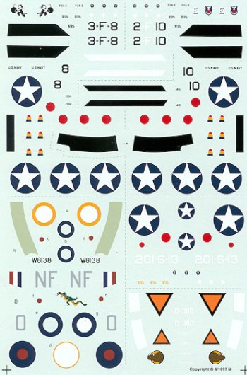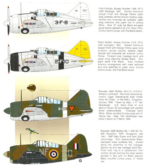 Anyway, the Aeromaster sheet includes three US F2As. One each from the USS Saratoga with the white tail, one from the USS Lexington with the yellow tail and one overall grey version from VMF-201 (not shown). The two USN versions are the 'yellow wings' variety and quite colorful.