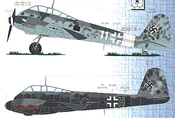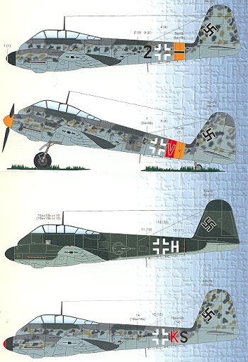 Finally, an Me-410B-1 of 14./KG 2. This is in RLM 74/75 uppers with black undersides. It also has flame dampening exhaust. Your editor built this plane in 1/48 and it makes a super model.