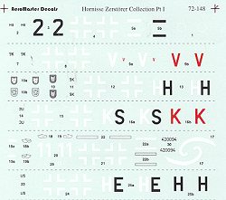 This sheet duplicates many of the 1/48 schemes found on those larger scale sheets. However with the smaller size of the markings comes the ability to do more planes. Frankly, as with most German aircraft, they are little more than insignia and codes. The sheet looks a bit small as I've cropped off the lower section which is just insignia.