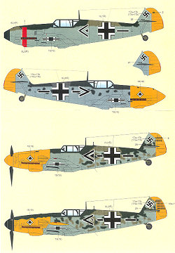 2. Bf-109E-4 from Oct 1940. but this time the whole nose was yellow and the badge returned. Very light mottling and though the profile shows RLM 71/02/65, the commentary states RLM 74/75/76.