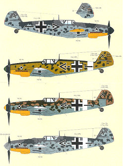 7. Bf-109G-2 from spring of 1943 in Sicily. RLMY 78/79/80 with white fuselage band and wing tips. Lower cowling and tip of spinner in yellow.