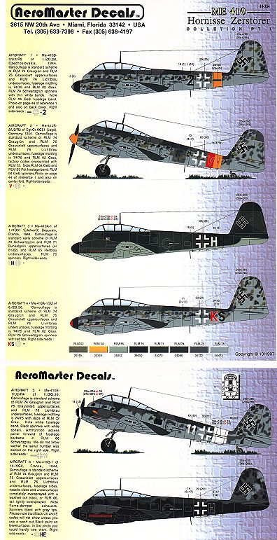 Aeromaster has again provided us with a fine sheet for the Pro-Modeler Me-410B-2. This particular sheet does six different aircraft and comes with the usual colorful instruction sheet.