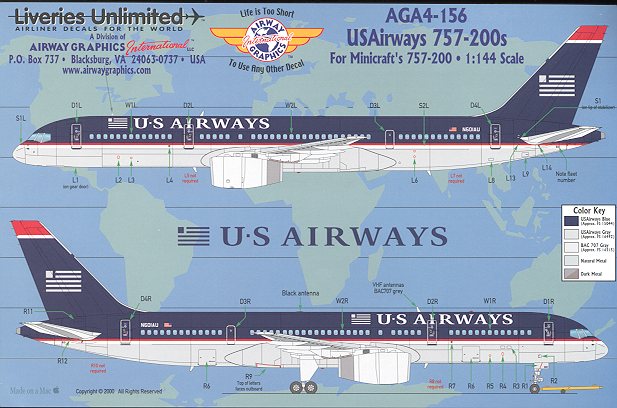 It is hard for me to believe that the B.757 may be nearing the end of its first run with major airlines, but according to the instruction sheet, these are all soon to be replaced at US Airways with Airbus aircraft! Many have found the current US Airways scheme to be very nice, especially compared to the previous one. The almost black dark blue is a nice color, though one must wonder how much extra cooling is needed thanks to the dark scheme.
