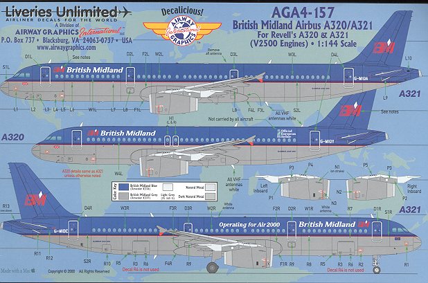 Liveries Unlimited has produced another super sheet, this time for a European Carrier; British Midland. This sheet is designed for the new Revell 1/144 Airbus A.320/321 kit. In order to do a proper BM airliner, you need to get the Lufthansa 321 kit. The main reason for this is that it has the correct IAE V.2500 engines that are on all British Midland Airbus aircraft.