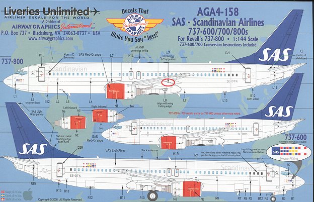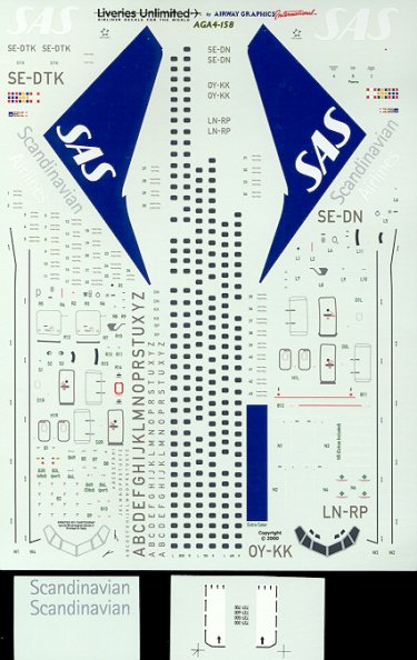 Liveries unlimited has includes all the registration numbers so that you can do any of the fleet. In addition, the word 'Scandanavian' has been included as printed on an ALPS printer as it produces superior metallics to that done by normal silkscreen decal processing. LU has also provided a separate decal for the overwing escape markings.
