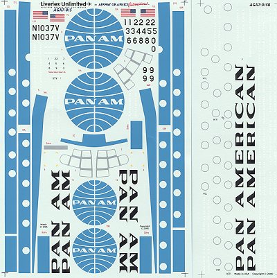 Liveries Unlimited has come out with a very impressive decal sheet for this aircraft. Unlike the kit decals, this is the later scheme that came out about the time that Pan Am was starting Boeing 707 jet service. It is basically the scheme that was carried until the 'billboard' scheme. That one was in use when the airline went into bankruptcy in the late 1980s. (FYI, Pan Am has started flying again, but is now a very small airline with a fleet of 6 modified 727s serving smaller airports).