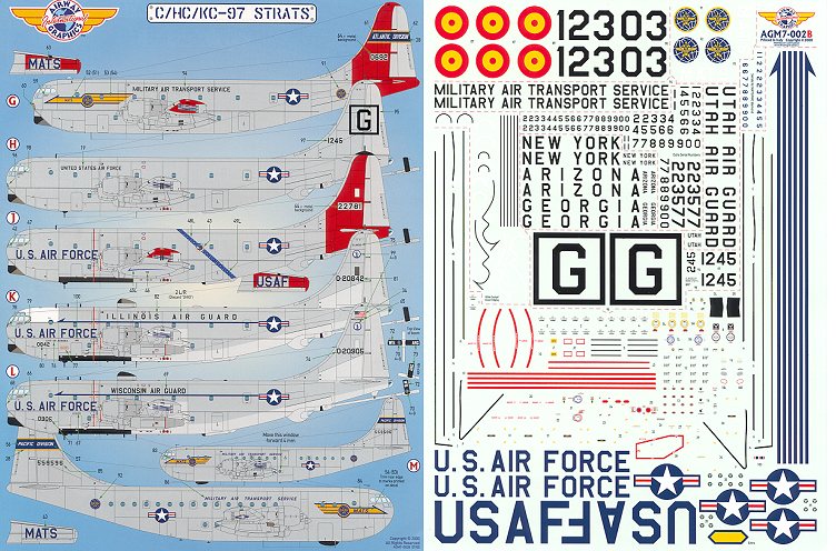 The lone KC-97G is aircraft J on the sheet (there is no 'I'). This one is from the late 1950s and is unique only in regards to the marking on the wing tank, typical of KC-97s of the time period.