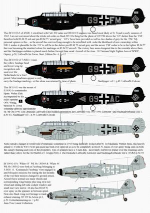 The last 109 on this sheet is an all black Bf-109G-6/AS from 2./EJG 2. This was used in the Night Fighter Training Staffel on anti-Mosquito missions. The drop tank is the only part of the plane that isn't black.