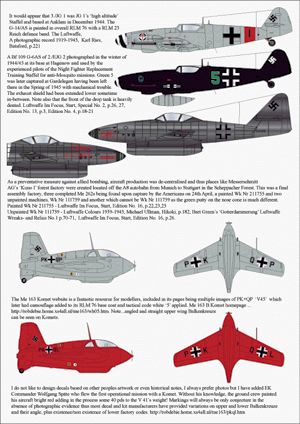 Finally, a pair of Me-163 Komets. The first is inn overall RLM 76 and is one of the large number of prototypes, V45. Next is the overall red Komet of Wolfgang Spate. This plane has never been photographed so all the markings (including the color) are based on personal anecdotes and speculation. However, it is a popular modeling subject.