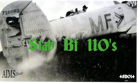 AIMS next sheet is for the Bf-110. This sheet is 1/48 scale and includes not only the same options as in their 1/32 sheet, but a LOT more. In line with the previous offering, this sheet covers airplanes operated by the geschwaderstab or the headquarters flight if that is easier to say. The 1/32 sheet was limited to the earlier versions of the 110 as no one does the later versions in that scale. Such is not the issue with this one as modelers have been blessed with all sorts of 1/48 110s from Fujimi, Revell, Dragon and Eduard to name a few.