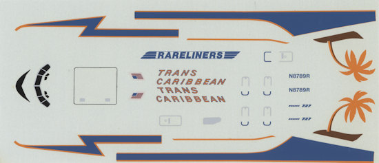 This particular sheet is from the now defunct Rareliners company. As you can see, it includes the basic markings, door openings and cockpit windows. It also offers paint information. Unfortunately, the upper color needs to be mixed and the references are for Floquil and Pactra paints, both companies bought out by Testors and their lines long discontinued. The decals are for Trans Caribbean's lone 727-100. At the time of this sheet, the -100 was the only 727 kitted and offered by both Airfix and Revell. While both of these kits have not been produced in a long time (I think the Airfix version was modified to do the longer -200), they are not difficult to find with a bit of searching. I should add that Aurora did an early 727, but I'm not sure of the scale. Instructions show both sides of the aircraft, but only offer fuselage paint information.
