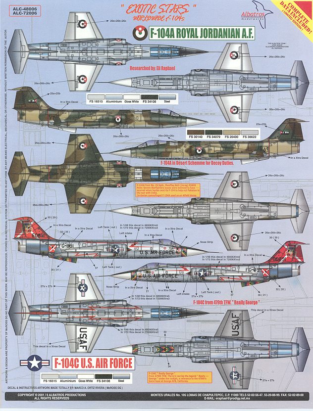 Well, Albatros has done it again. Yet another superb decal sheet. This time, it covers a number of F-104 Starfighter operators. In fact, you could probably go through a case of Hasegawa F-104s on this sheet without any trouble! In fact, there are 20 different schemes portrayed in the instruction sheet and doubtless several more could be made by switching around numbers.