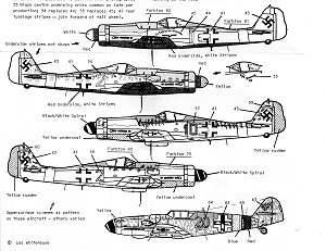 Two other FW-190Ds are included such as Yellow 2 and Black 10. Both of these JG 54 aircraft are in late war colors with the old style canopy used before production switched in January 1945 to the 'blown' hoods. These were used to support Kommando Nowotny.