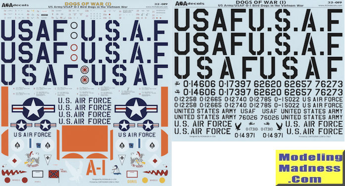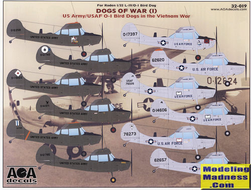 This particular sheet covers seven US Army schemes - 21st Black Aces (two schemes, only one shown in cover image), 199th Swamp Fox, 203rd Hawkeyes, 220th Catkillers, and 221st Shotguns Reconnaissance Aviation/Airplane Companies (RAC). It also portrays six USAF options. Note that all the Army planes are in olive drab while the USAF planes are in ADC grey.