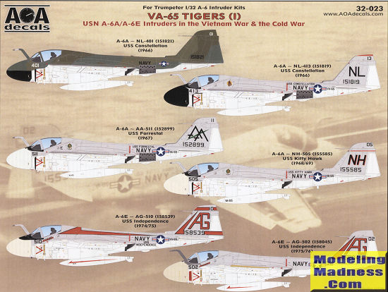 AOA Decals continues to bring us excellent decal sets with this first set on the aircraft of VA-65 'Tigers'. This unit was one of the first to fly the A-6, with its first cruise in the waters near Vietnam in 1966. Its last was to the Persian Gulf in 1991 and the unit disestablished in March of 1993.
