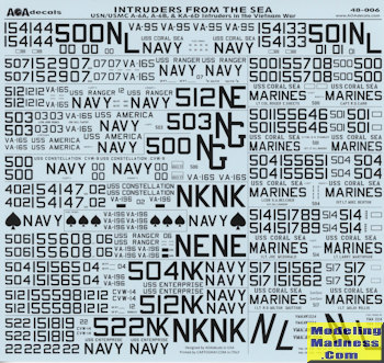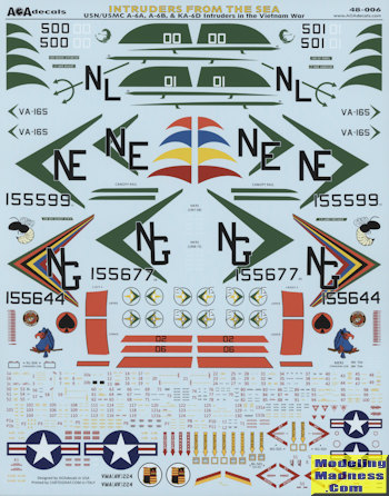 AOA Decals returns to the Intruder and reduces their fine 1/32 set for the 1/48 model builder for this next set of markings. It is quite an ambitious undertaking but AOA has proved that they are able to provide us with a wide variety of markings for the planes in question. This particular set is designed for the Hobby Boss A-6A, but if you have the old Fujimi kit, some of these schemes could well be used on that one. These are all A-6A, A-6B, or KA-6D aircraft that operated during the Vietnam War.