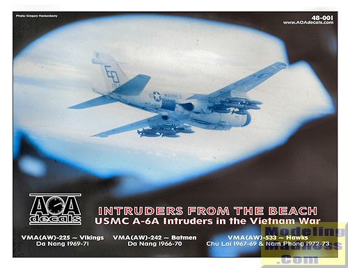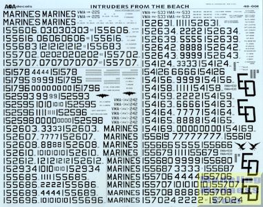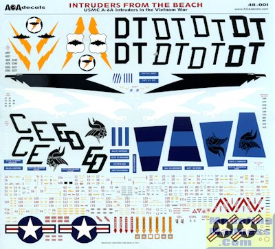 This set contains markings for three USMC Intruder squadrons that were based in Vietnam. There are 7 options for aircraft from VMA(AW)-225 Vikings based at DaNang from 1969-71. A note that there is an error in the ready-made rudder markings so the builder will need to paint the rudder and apply the separate marking.