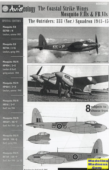 and covers the F.II and FB.VI variants of the Mosquito. There are eight markings