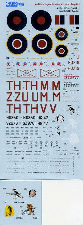 The instruction booklet that includes a number of photos of all aircraft as well as a detailed markings placement guide. Information on the equipment of each aircraft is also provided. In addition, there is a full modeler's guide to ensure that you can properly model each aircraft as there are often detail changes in an airframe during production and the Mosquito was no exception. There is a small slip that allows the purchaser to access full color markings guides via the Aviaeology web site. The decals themselves are superbly printed; clear and crisply done with no registration problems. You will also notice that all of the nose art decals are in two pieces. They provide the background separately so you get good color rendition.