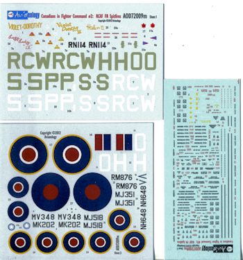The sheet itself is 1/72 and is also available in 1/48. The only ready to go Spit from this set is a FR.XIVE by Fujimi and it is the bubbletop version. Fujimi also does a high back Spit XIV, but it will need to have the camera windows added. There is no kit of the photo recon Spit IX. However, Aviaeology has provided 1/24 scale plans that you can size down to 1/72 to enable you to build some of these very interesting aircraft.