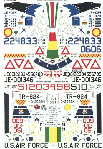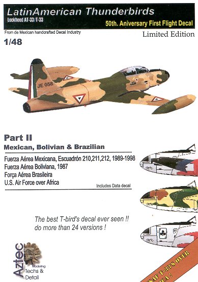 Aztecs sheet is the second of two sheets on this plane. An early sheet it differs from later ones by having a basically black and white instruction sheet. Actually, booklet would be closer to the truth as it is chock full of information not only on the decals, but also on the planes themselves. The listing on Mexican T-33s gives colors and serials for what seems to be every T-33 used by the air force. Some of it is in Spanish, but easy to figure out. The instruction sheet also gives detailed data and decal placement information as well as colors used.