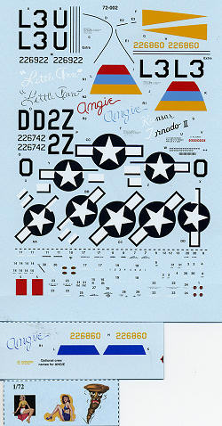 The second is "Little Ann", as flown by an unknown pilot. This one has the remnants of invasion stripes as does the first option. These will also need painted. For the tail, use the markings with the darker blue. Note also that the unit codes are not exactly the same size so be sure to follow instructions on which go with which aircraft. This one has a darker blue in the fin stripes and that is provided on a smaller sheet along with a darker blue 'angie' for the plane name.