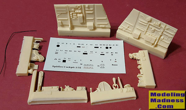 This latest 1/32 upgrade part from Barracuda Studios is for the Revell Spitfire IX. It is a cockpit in their 'snapshot' series. You will notice that it includes new side walls, control stick, gunsight, compass, canopy jettison pull handle, along with various bits and pieces that fit on the sidewalls. You also get some black wire for the control stick cables and you are provided with a decal sheet that has placards and some instrument dials.